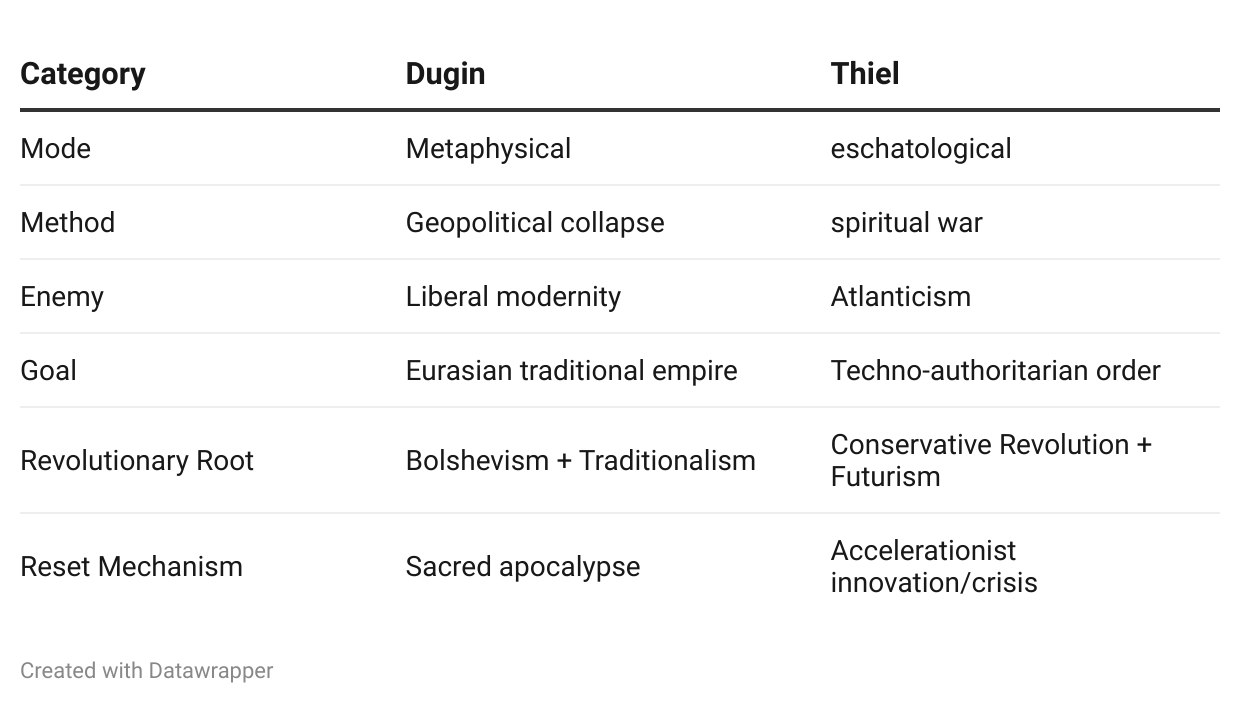 Both are comfortable with authoritarian structures (Dugin: sacred empire; Thiel: CEO-sovereign).