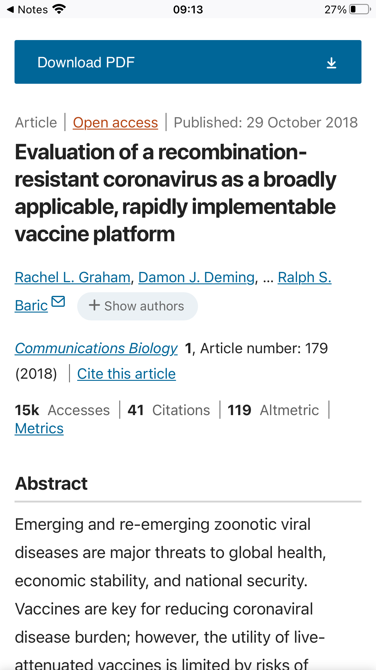 So [Moderna] wanted to evaluate mRNA vaccine performance, and so they contacted us and we worked with them on mRNA vaccines for MERS coronavirus mostly, but also SARS coronavirus in 2003, and were actually writing the paper in December 2019 when COVID hit
