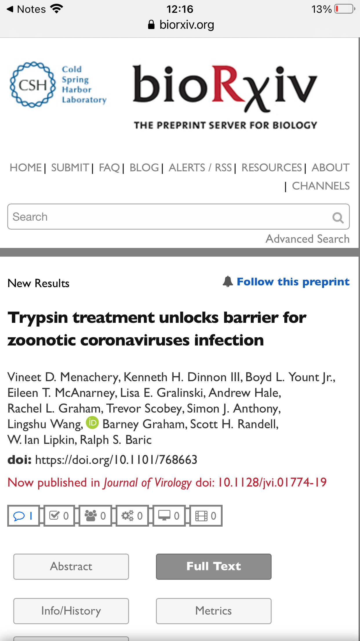 Note-In 2019 (September 16) Ralph Baric published a paper on the use of Trypsin