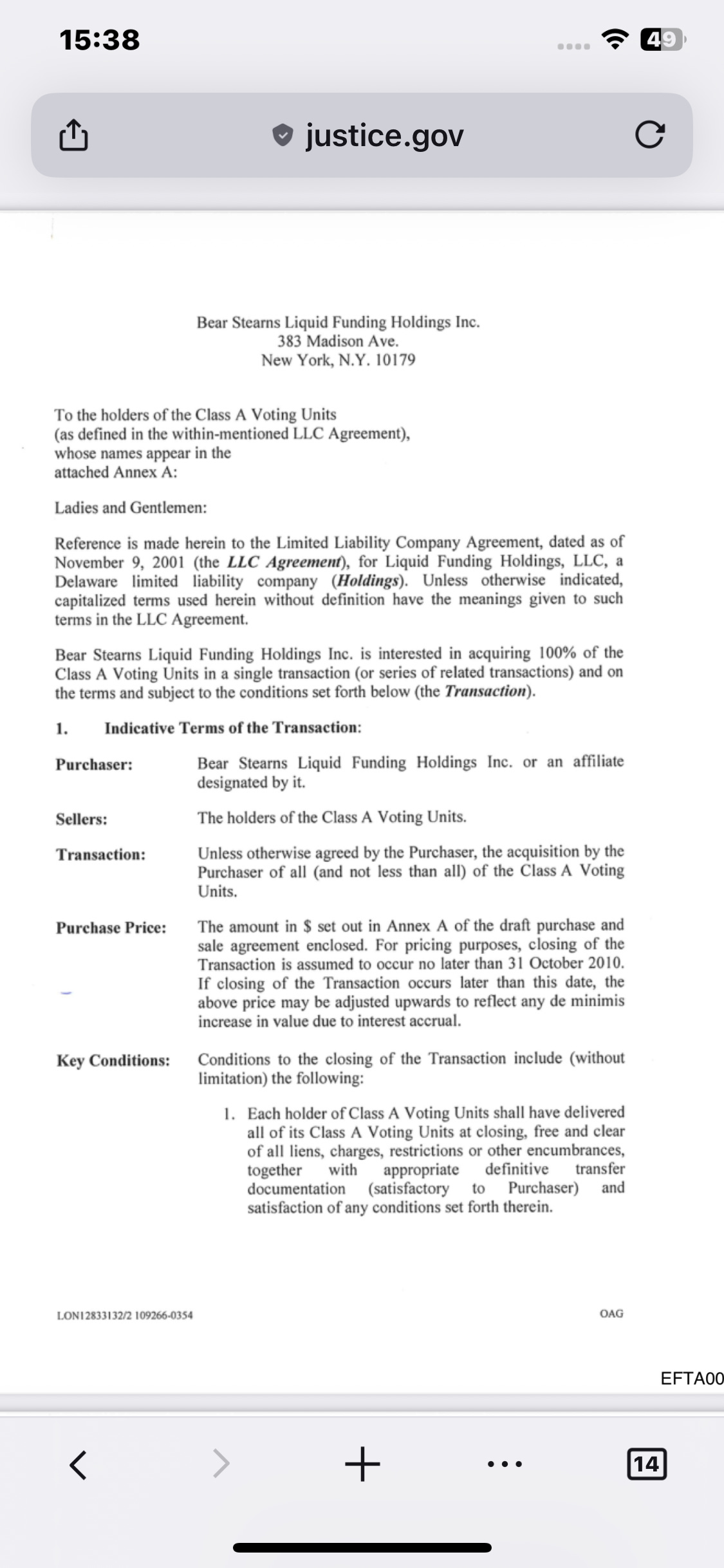 Bear Stearns had a 40% financial interest in Liquid Funding. The rest of equity was provided by Trusts, including Epstein’s Financial Trust which was 1 of 11 holders of Class A Voting units