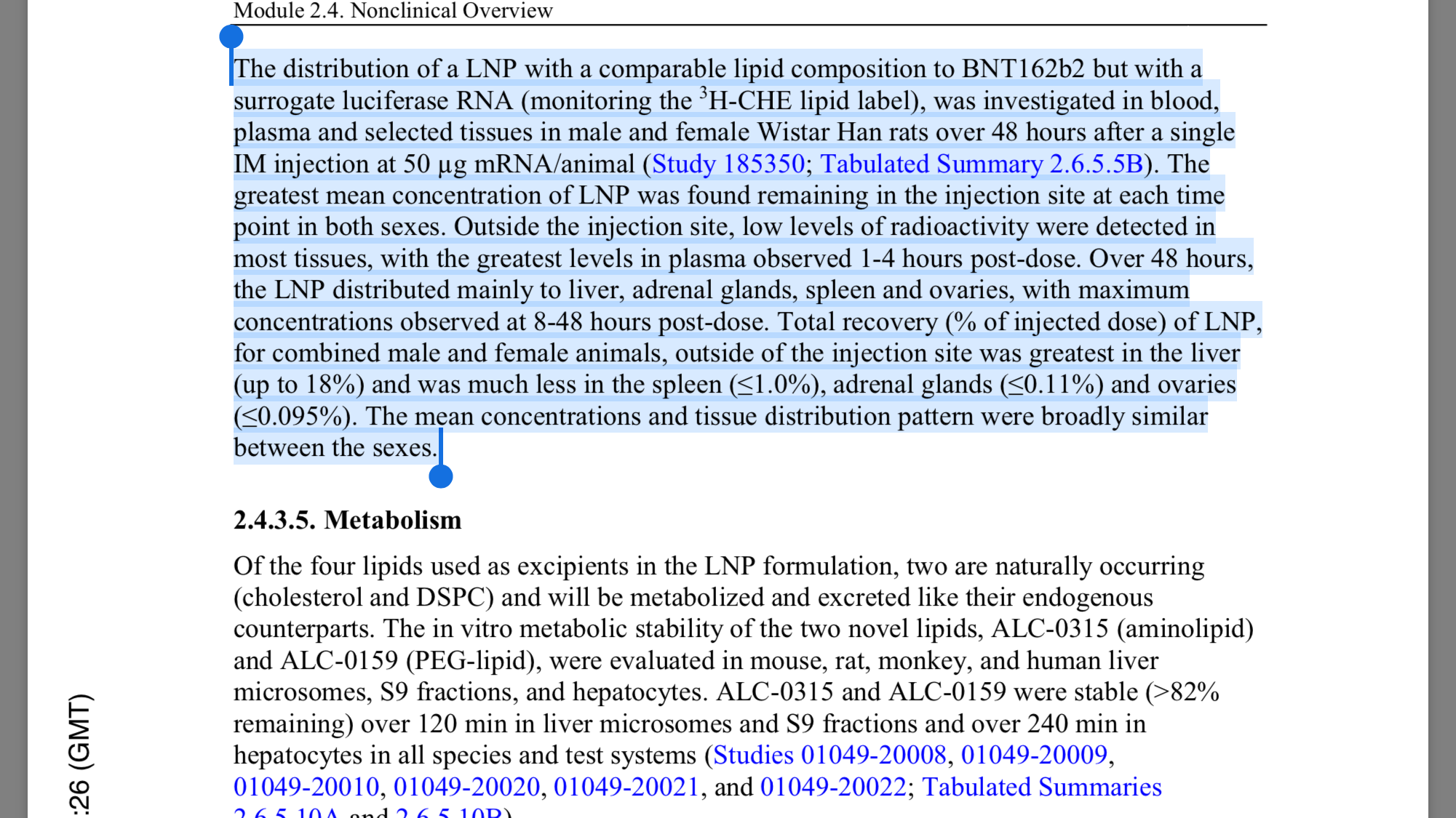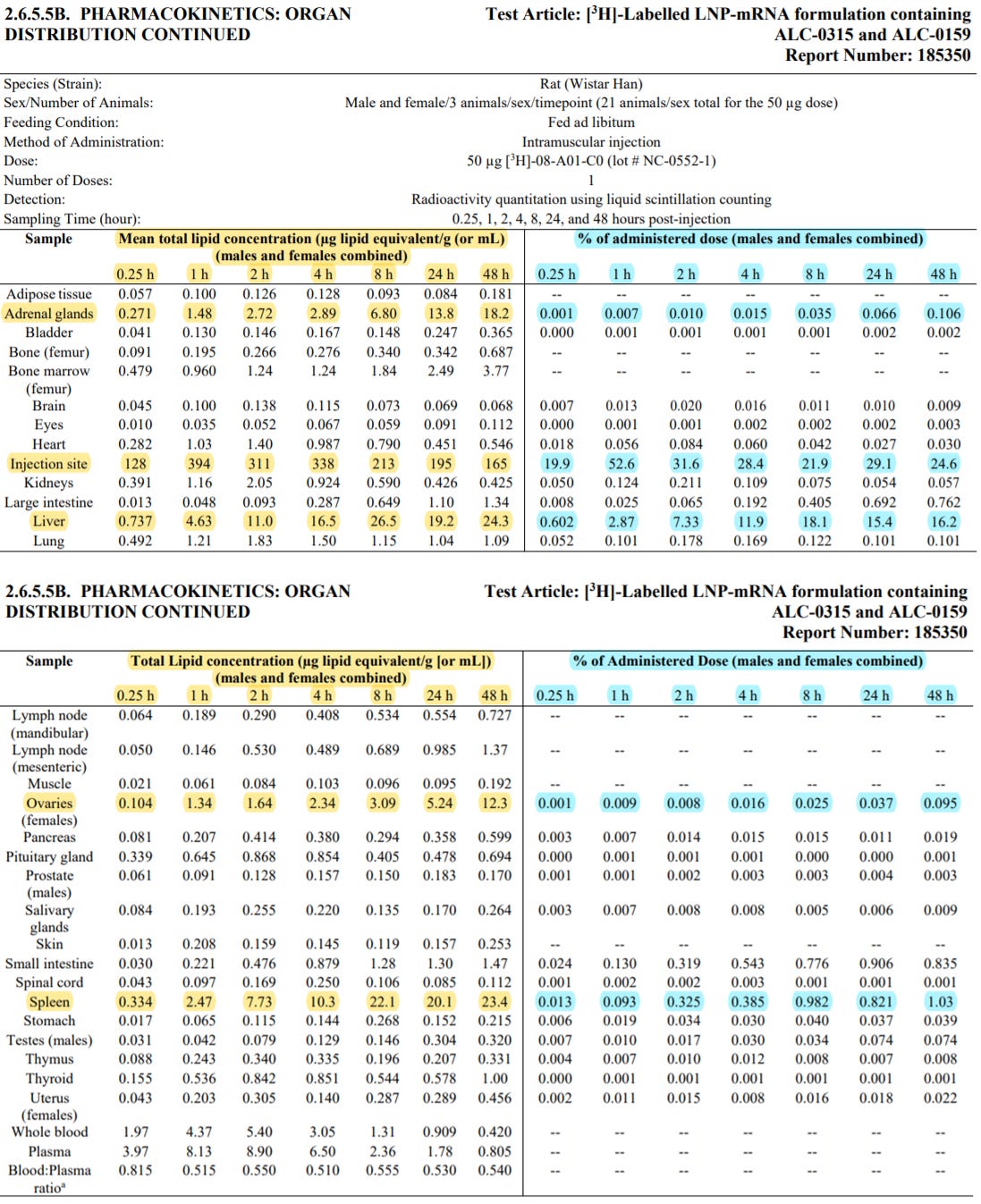 16a/Pfizer used a luciferase mRNA but only tracked the lipids in the LNP. Moderna used a study on a different mRNA and lipids . Both of them used mice